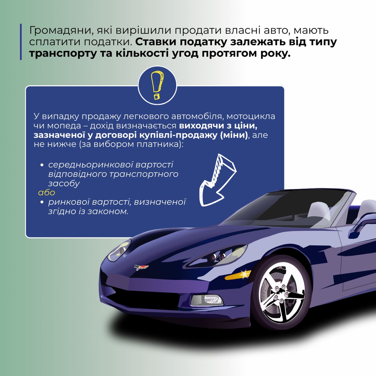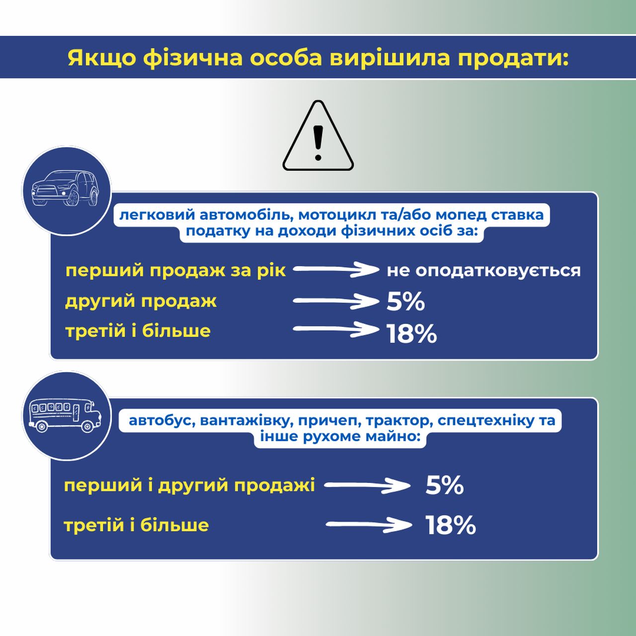 У Головному управлінні ДПС у Полтавській області повідомляють, що громадяни, які вирішили продати власні авто, мають сплатити податки. Ставки податку залежать від типу транспорту та кількості угод протягом року.