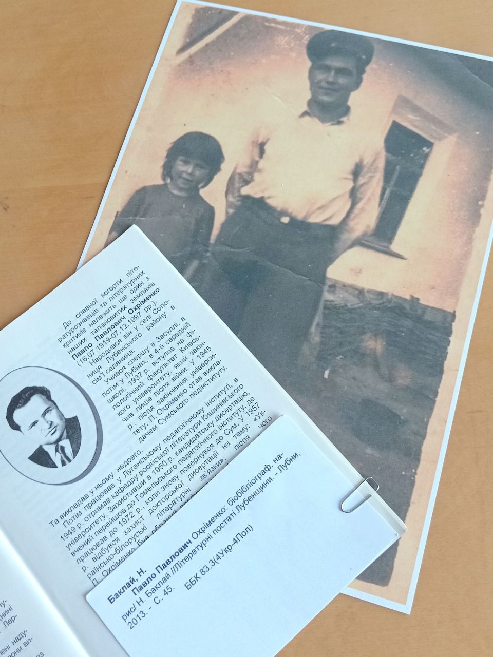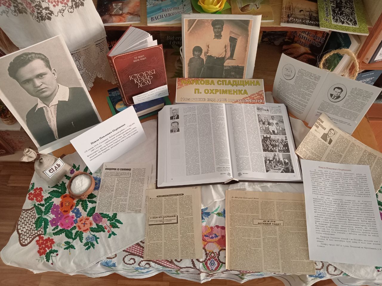 З цієї нагоди працівники Публічної бібліотеки імені Малика підготували ювілейну викладку "Наукова спадщина Павла Охріменка". Серед низки енциклопедичних та публіцистичних видань знайшовся й цікавий факт: саме нашому земляку в 70-х роках належить честь і слава відстояти в науковому колі авторство "Слова о полку Ігоревім", яке вирішили проголосити набутком російської культури. Приваблюють око і ретро - світлини нашого земляка, зроблені у 50-х роках ХХ століття. Ми дуже вдячні за них нашій колезі, бібліотекарю Людмилі Спесивцевій, адже саме в її родинному архіві збереглися фото юного Павла Охріменка. На одній зі світлин він стоїть, ймовірно, під рідною хатою, призьбу якої заплетено тином. "Саме від батьківського порогу починається любов до великої Вітчизни - до України", - зазначав Павло Павлович ще 1994 року. Не можемо не погодитись із цією думкою славного земляка. Світла пам’ять прогресивному вченому, що весь свій вільний час присвятив "любимій справі" - дослідженню краєзнавчих сторінок Лубенщини.