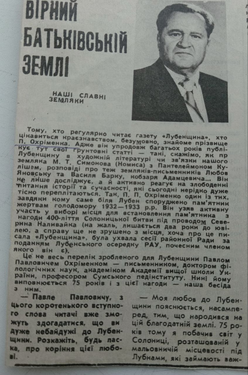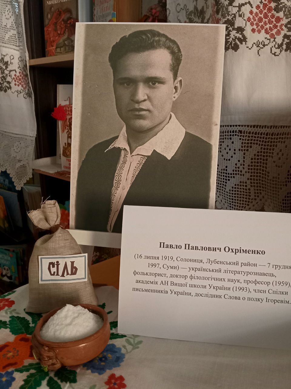 Саме цього дня, рівно 105 років тому, на солончаках славного козацького села Солониця, що на Лубенщині, буремного літа, 16 липня 1919 року, народився майбутній професор, академік та літературознавець Павло Охріменко. Про таких людей дійсно кажуть «сіль рідної землі», адже за плечима Павла Павловича підготовка тисяч учителів-словесників та не менша кількість наукових праць. І хоча основний професійний шлях науковця припадає на Сумщину та Молдову, наш край залишився у пам'яті та працях Павла Охріменка на все життя. Саме йому - краєзнавцю, мовнику та фольклористу належать дослідження постатей письменників Матвія Номиса, Пантелеймона Куліша та Василя Барки, козацького ватажка Наливайка і кобзаря Адамцевича. Він був одним з ініціаторів спорудження пам'ятника жертвам Голодомору. Тож недарма професор навіть на схилі літ підписувався так: "Академік наук вищої школи України, уродженець с. Солониці".