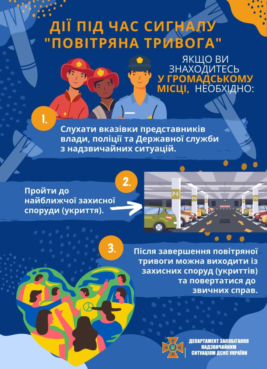 кожному негайно слідувати до найближчого укриття. Для цього завчасно дізнайтеся про місце розміщення укриттів біля вашого будинку чи місця роботи (якщо ви досі ще цього не зробили);
