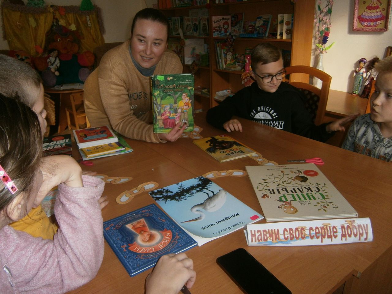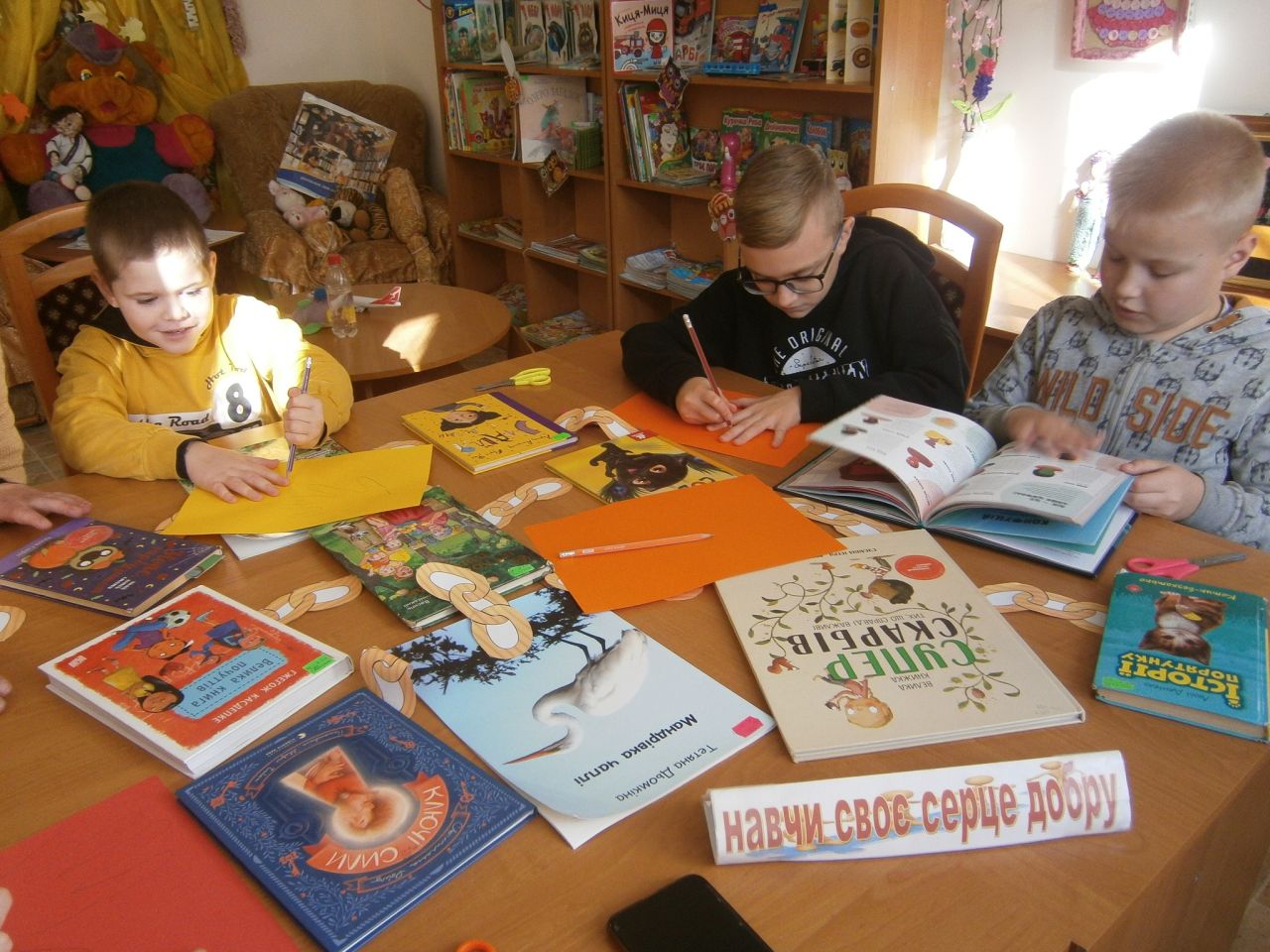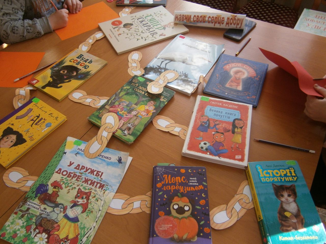 На дітей чекали в бібліотеці добрі історії, вірші та мотиваційні книги, з яких вони складали ланцюжок добра. Із задоволенням присутні грали в колективні ігри, виконували цікаві завдання та вирізали свої долоньки добра із синонімами цього слова. На завершення, як завжди, смачне чаювання .