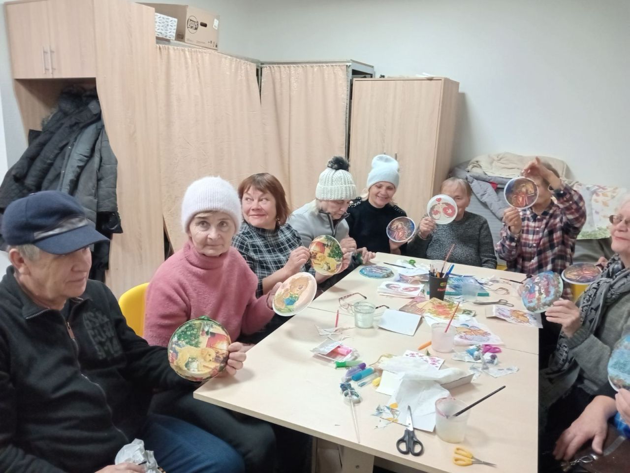Логічним продовження зустрічі стало арттерапевтичне заняття «Декупаж – креативна техніка для хобі». Під час майстер-класу, який провела бібліотекар Лариса Гончарук, присутні виготовили власноруч новорічні прикраси з пластикових тарілок та декупажних серветок. Творче заняття подарувало людям гарний настрій та передчуття чарівних новорічних свят.