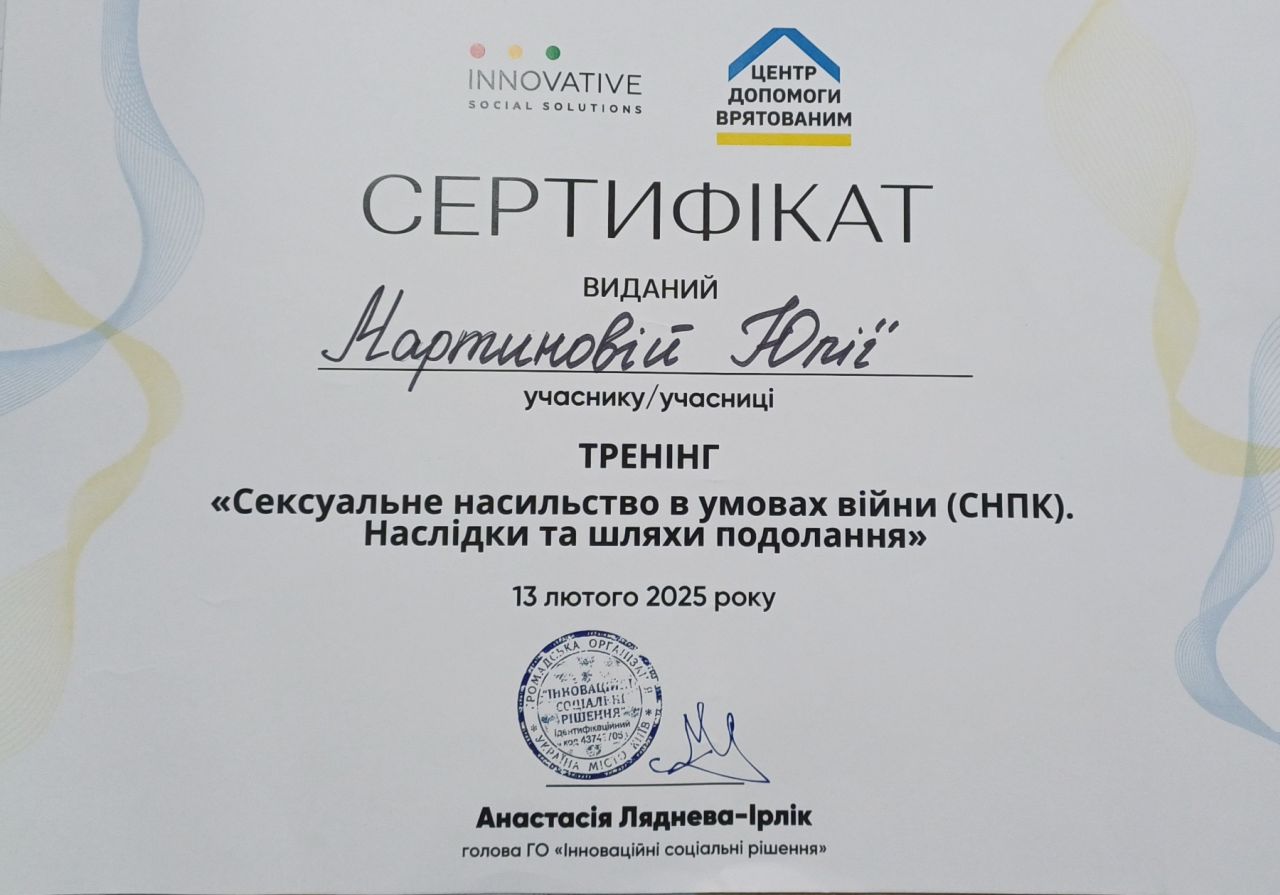 13 лютого практичний психолог Мобільної бригади соціально-психологічної допомоги особам, які постраждали від домашнього насильства та/або насильства за ознакою статі Лубенського міського центру соціальних служб Юлія МАРТИНОВА взяла участь у тренінгу «Сексуальне насильство в умовах війни (СНПК). Наслідки та шляхи подолання», проведеному Полтавським обласним центром соціальних служб спільно з Центром допомоги врятованим у Полтаві.