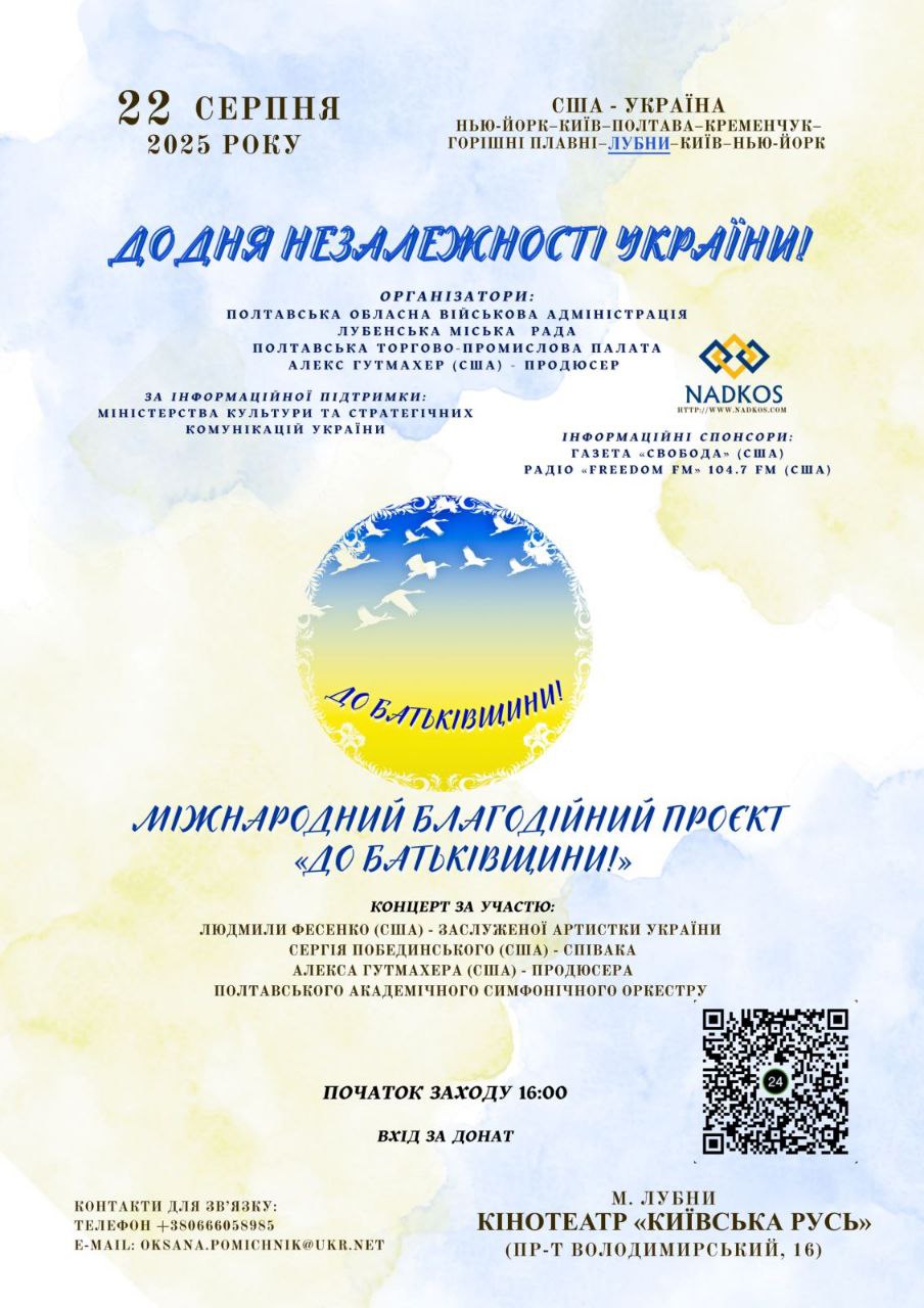 22 серпня о 16:00 – благодійний концерт у рамках Міжнародного благодійного проєкту «До Батьківщини!» з нагоди відзначення Дня Незалежності України на сцені кінотеатру «Київська Русь».