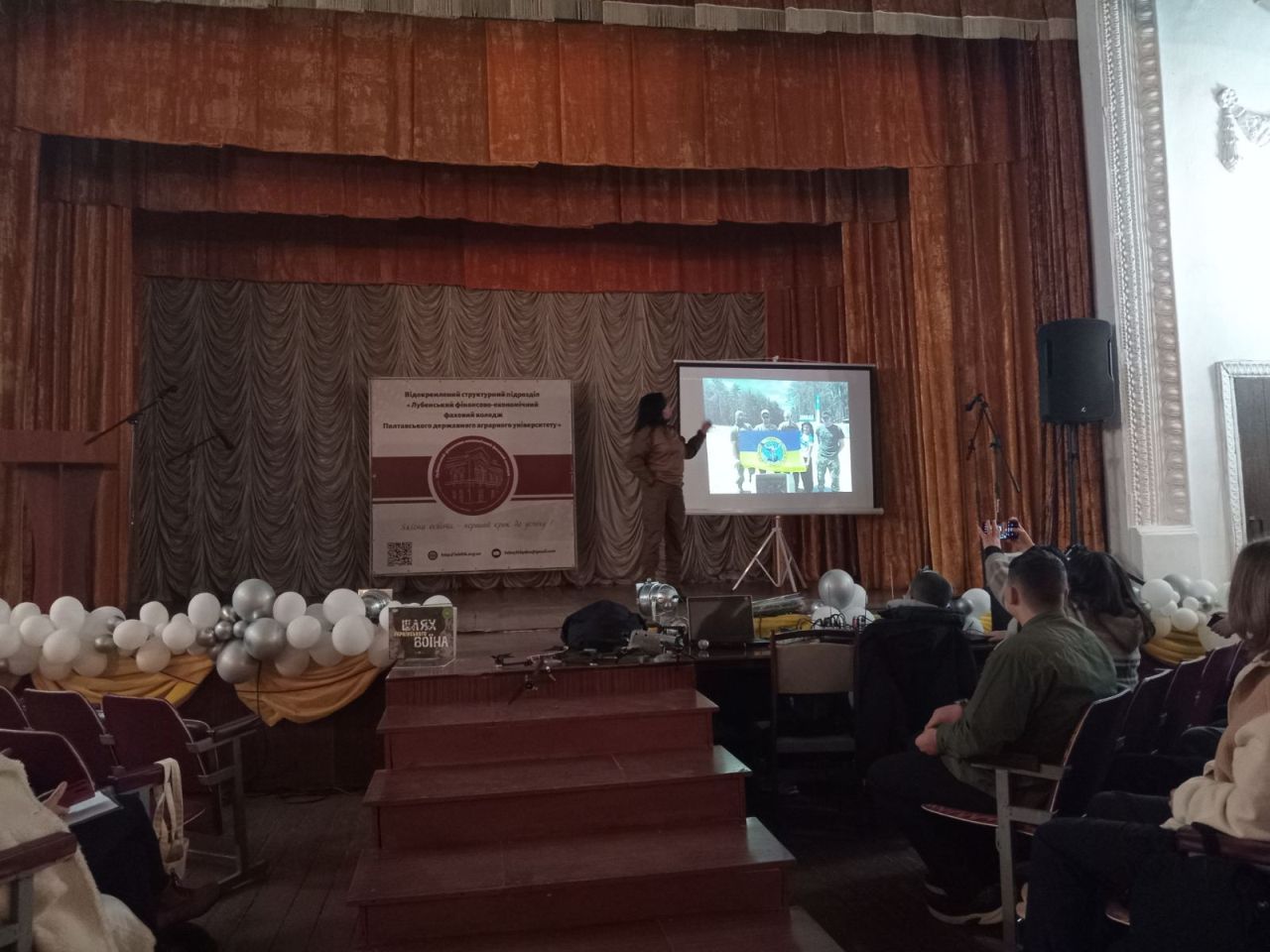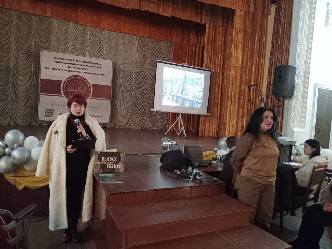 З нагоди Дня захисників і захисниць бібліотекарі Публічної бібліотеки імені Володимира Малика Лариса Гончарук та Марина Кононенко долучилися до уроку військової грамотності у ВСП «Лубенський фінансово-економічний фаховий коледж ПДАУ». Провела його відома військова волонтерка, керівник Благодійного Фонду «Честь і Совість» Оксана Каневська, яку воїни називають феєю та берегинею. Ось фонд збирає на FPV-дрони, сітки та покриття. Ось пані Оксана особисто відвозить цінний вантаж на Сумщину, Донеччину та інші «гарячі точки», де служать наші земляки. А цієї осені, завдяки співпраці з Міжнародним Альянсом Захисників України, героїня зустрічі вже провела уроки військової грамотності в гімназіях «ПРОСВІТ», імені В. Роїк, М. Номиса та К. Скаржинської.