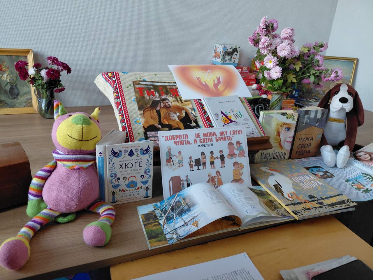 Бібліотекар Сніжана Кириченко розповіла цікаві факти долучення України до святкування Дня доброти, про створення у Харкові в 2014р. міста Доброти у формі пташиного гнізда, про символ свята – відкрите серце, яке спеціально до цього дня створив французький художник Орель, про традицію в цей день дарувати людям квіти – ніжні маргаритки і гербери.