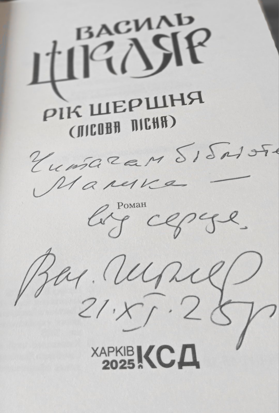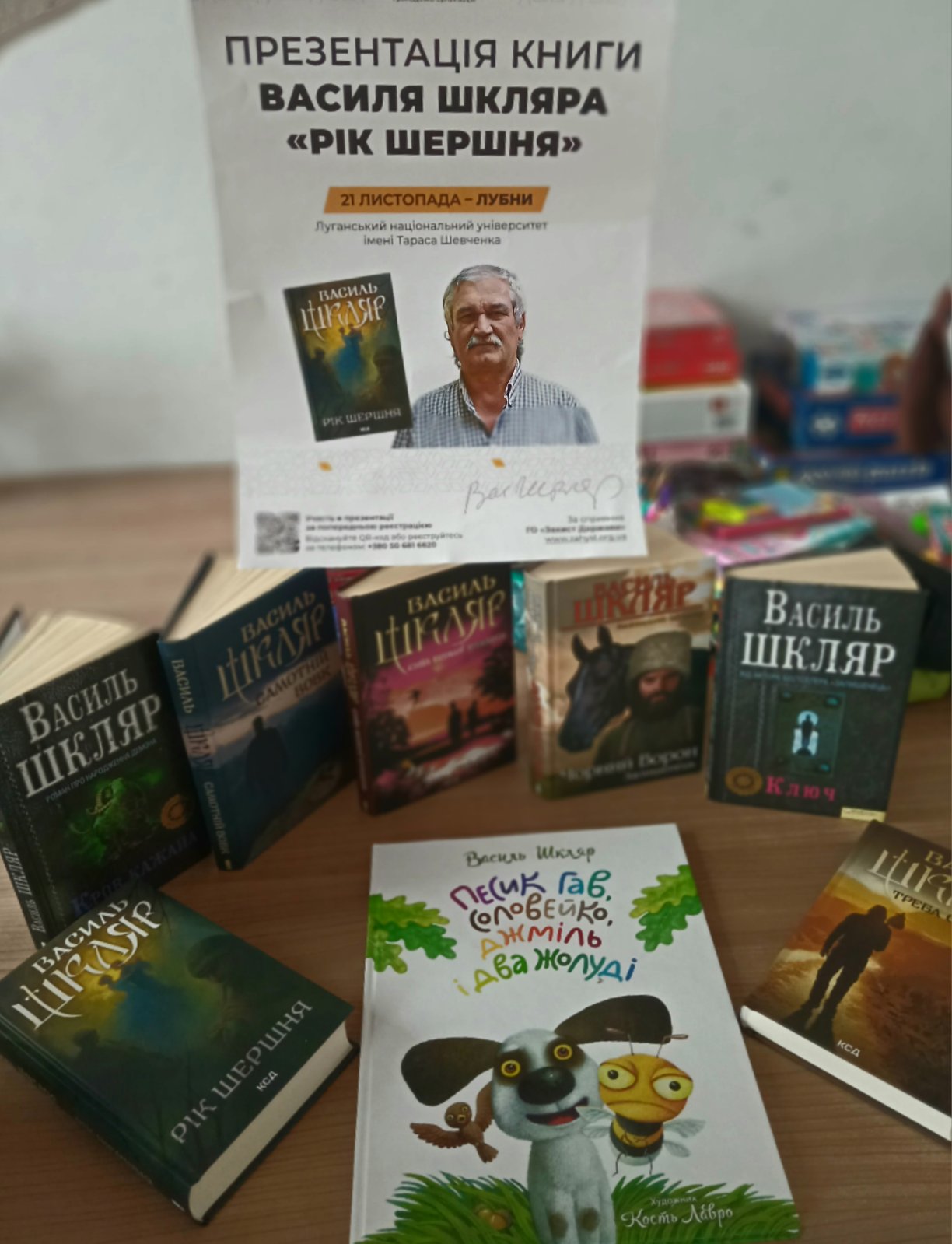 Автор розповів, що роман «Рік Шершня» почався із таємничого дзвінка невідомого, що запропонував показати печеру зустрічі гетьмана Мазепи зі шведським королем. На Шкляра чекала захоплива подорож, під якої сучасний партизан передав давні записи про повстанців 1920-х років. Тож не дивно, що істориків Олександра Карпенка, Наталію Антоненко та письменницю Ганну Кревську зацікавили подробиці документу та можливі зв’язки отаманів Сумщини з Лубенщиною. Живе спілкування, можливість придбати найкраще з доробку письменника та автограф-сесія залишили теплі й незабутні враження від зустрічі. Радіємо, що нині читачі бібліотеки імені Володимира Малика мають вісім книг із автографами Василя Шкляра. А його останній доробок придбали не лише міські, а й сільські бібліотекарі.