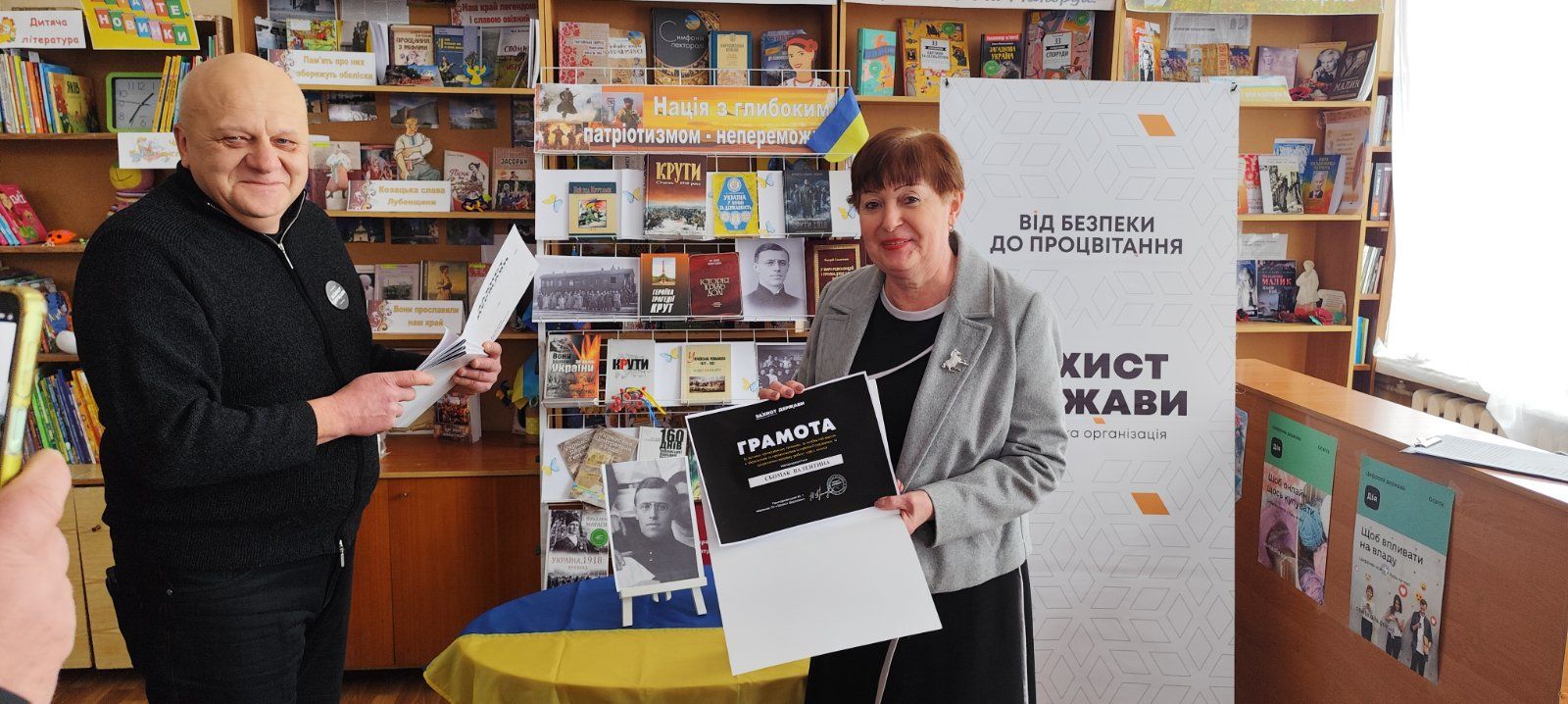 До заходу приєдналися представники громадської організації ГО «Захист держави» - керівник Лубенського осередку Віталій Головко та його заступник Віктор Симоненко. Вони вручили грамоти за активну громадянську позицію та сприяння реалізації просвітницьких ініціатив директору Лубенської публічної бібліотеки імені Володимира Малика Валентині Сьомак та учасникам заходу наголосивши, що ГО «Захист держави» системно працює у сфері військово-патріотичного виховання молоді, популяризації історії України, народних традицій та збереження культурної спадщини.