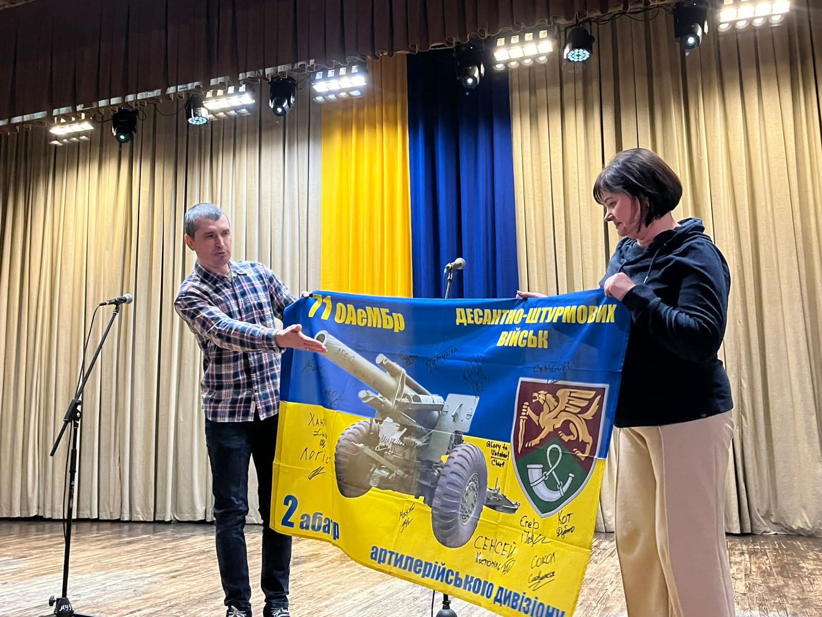 Подякував зі сцени та вручив прапори підприємцям-волонтерам Михайлу Сеню, Олександру Демурі, Центру культури і дозвілля за громадянську активність та допомогу армії (директор Інна Скиба). А от учениця одного з навчальних закладів громади, продемонструвавши знання з історії України, отримала в подарунок календар.