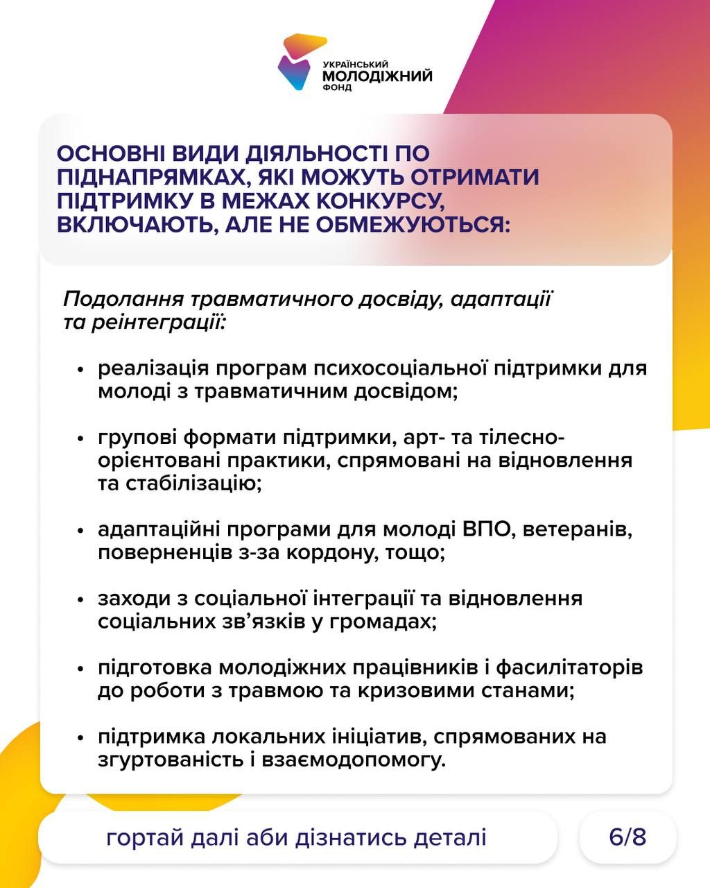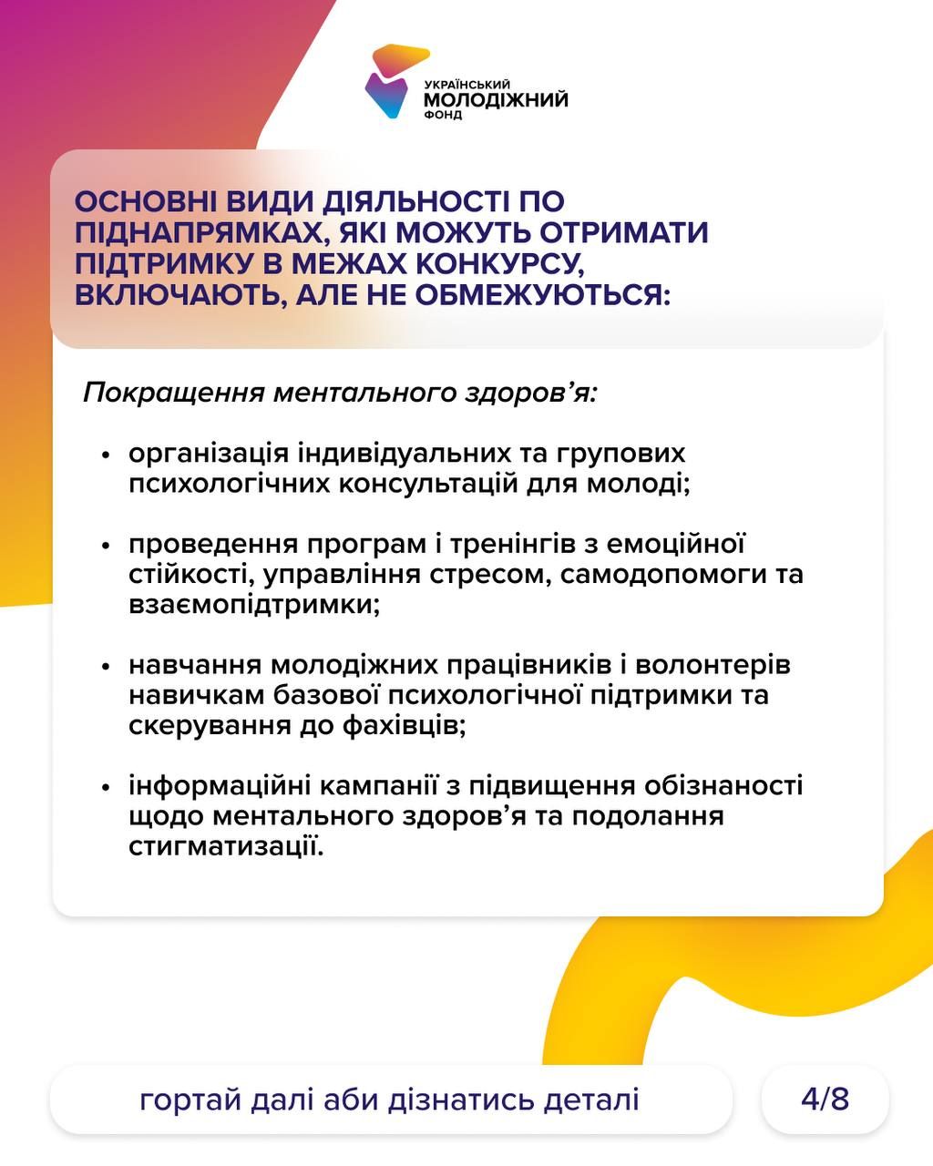 Коротко інформацію виклали на картинках, а от детальну інформацію знайдете на сайті УМФ - https://uyf.gov.ua/programs/blahopoluchchia-molodi-fo