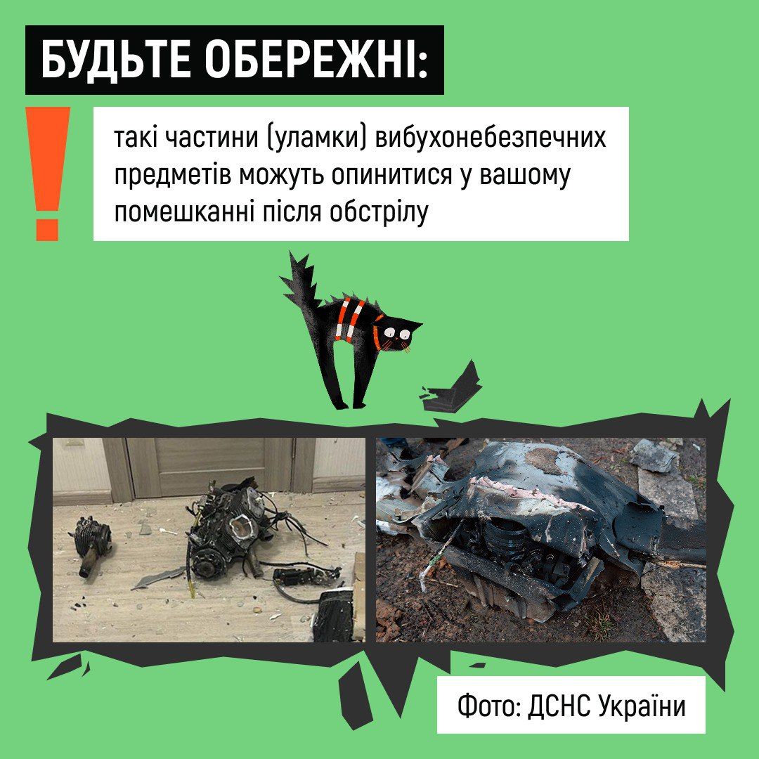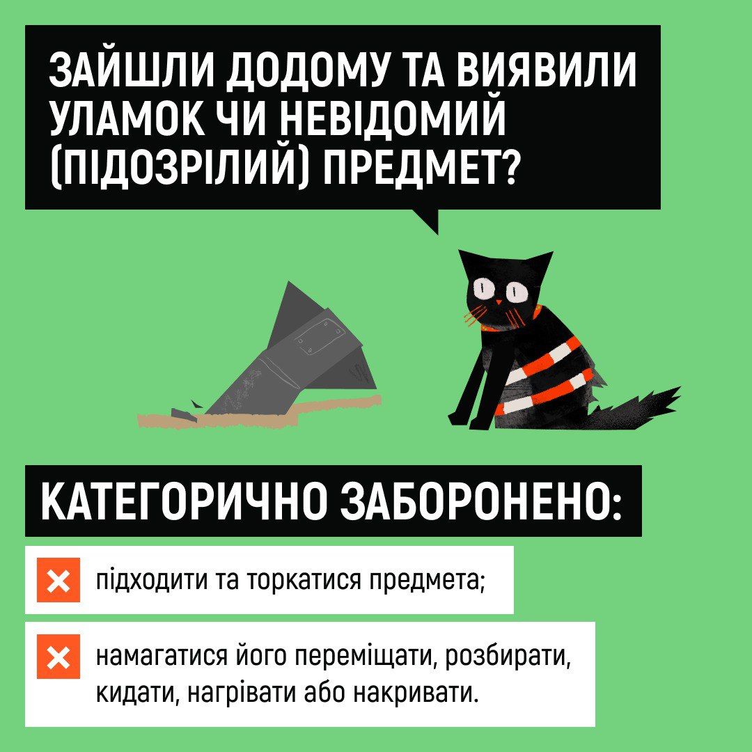 Гортайте картки, щоби знати, як правильно діяти в ситуації, якщо виявили вдома уламок чи підозрілий предмет.