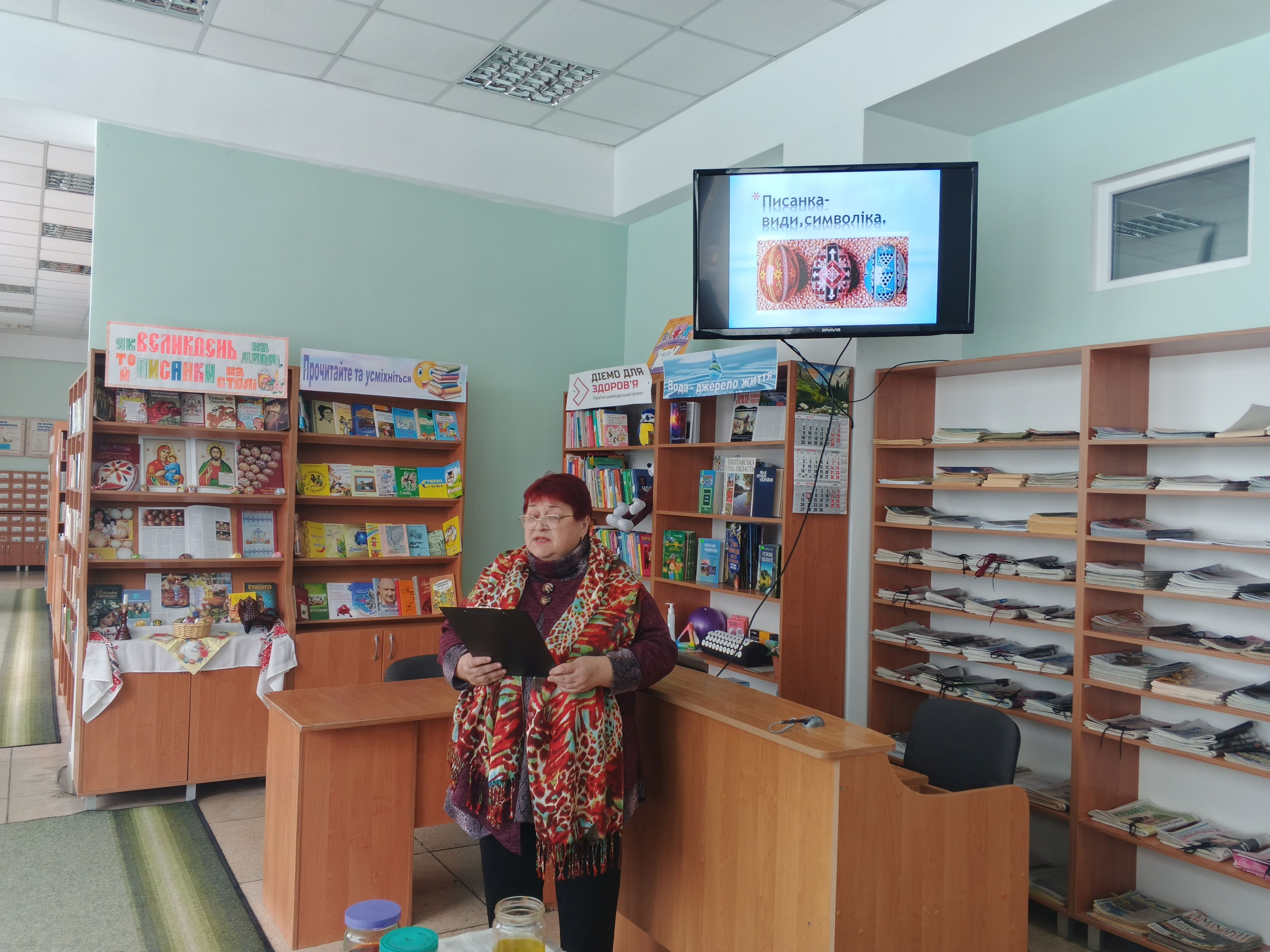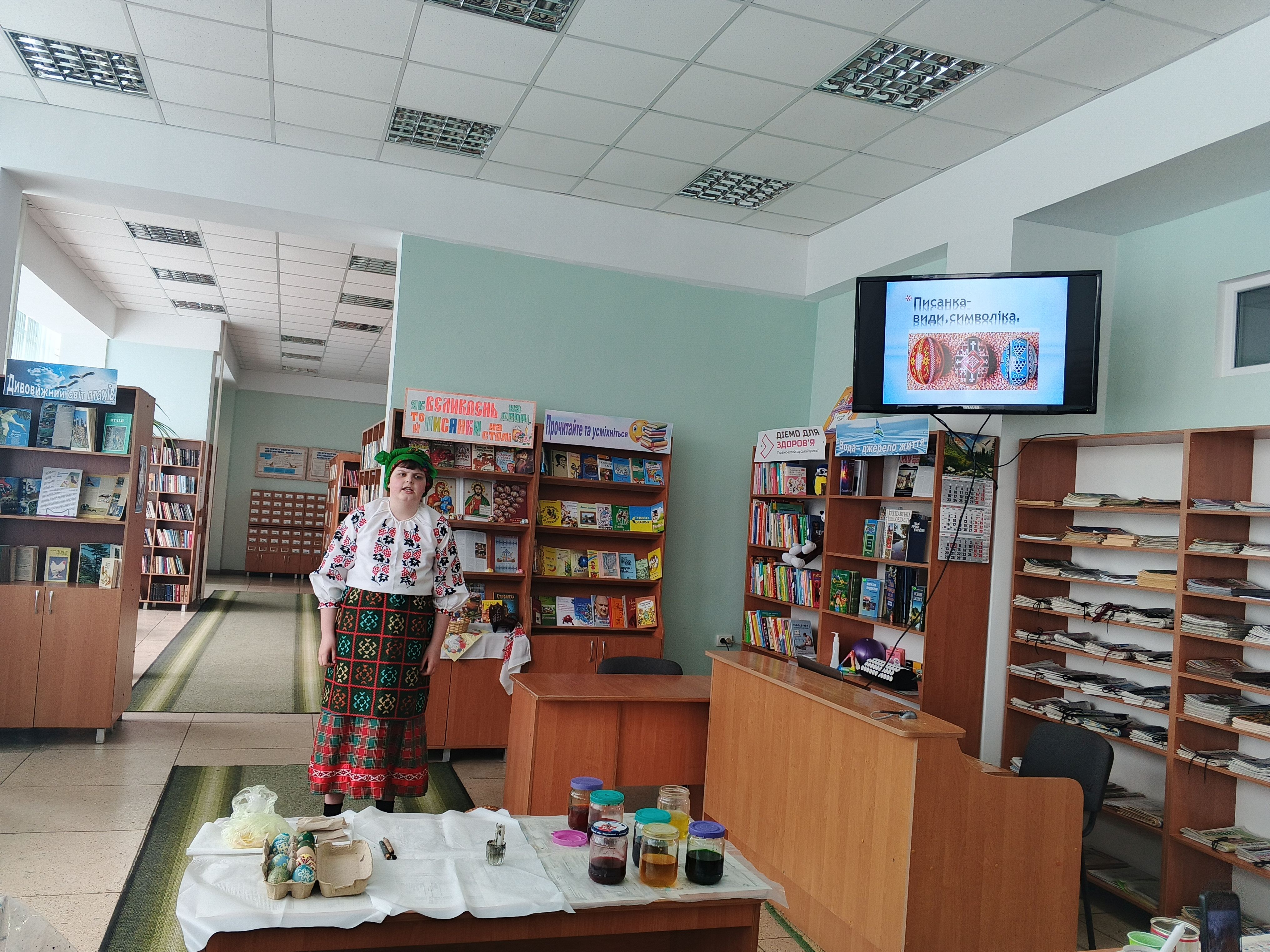 Тематична виставка-інсталяція «Як Великдень на дворі, то й писанка на столі», оформлена в книгозбірні до Великодня, допоможе охочим поглибити свої знання та відкрити нові грані писанкарства.