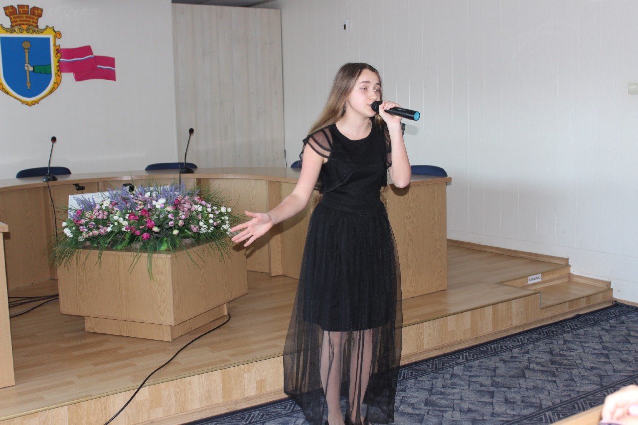 Також з нагоди свята присутніх жінок вітали пісенними композиціями у виконанні викладача вокалу музичної школи Аліни Соломахи та вихованців закладу Назара Петрусенка і Єви Данилко.